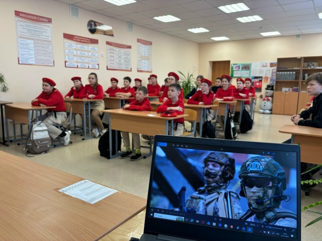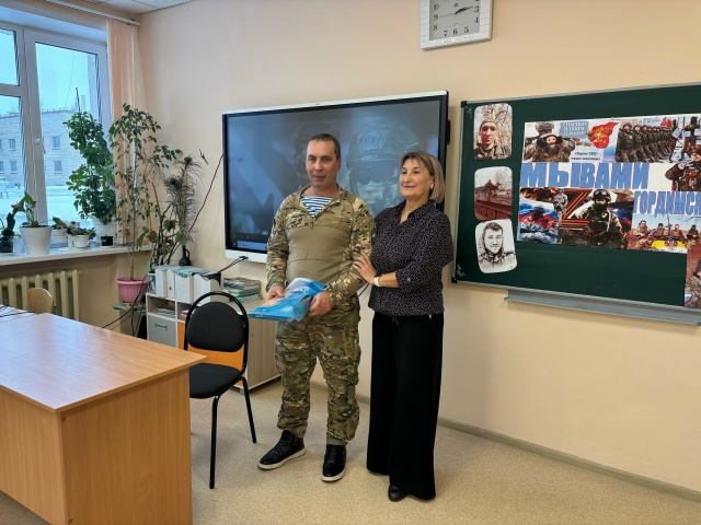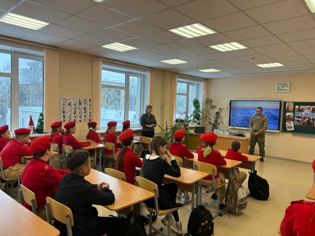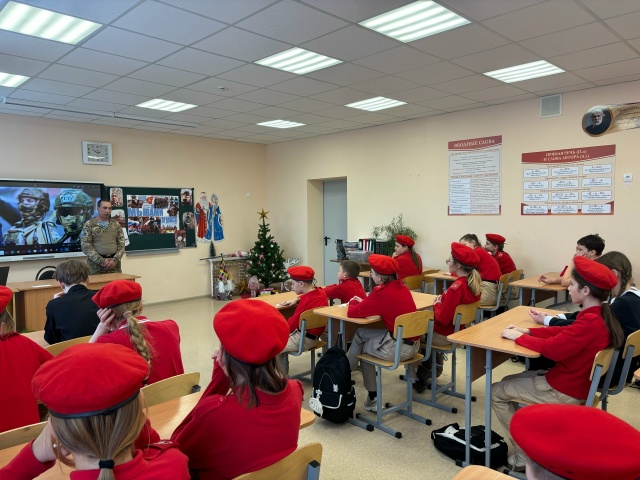 13 января в основной школе г. Спасска прошла встреча юнармейцев 6-ых классов с участником СВО В.И.Пичугиным, добровольцем Вооружённых сил России.